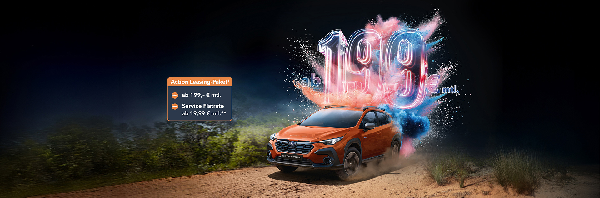 1 Die Aktion gilt vom 01.10.2025 bis 31.12.2025 in Verbindung mit dem Leasing eines aktuellen Subaru Crosstrek (Modelljahr 2024) (Neu- oder Vorführwagen), Zulassung/Besitzumschreibung bis 31.12.2025 bei teilnehmenden Subaru Partnern. Die Aktion wird von der SUBARU Deutschland GmbH getragen und ist nicht mit anderen Aktionen der SUBARU Deutschland GmbH kombinierbar mit Ausnahme des Aktionsangebots zur Service-Flatrate. Weitere Detailinformationen erhalten Sie bei Ihrem teilnehmenden Subaru Partner oder unter www.subaru.de. Subaru Crosstrek MJ24 Trend Leasingbeispiel (gültig bis 31.12.2025): Anzahlung 0 € EUR, monatliche Rate 199 EUR, Laufzeit 24 Monate Monate, Laufleistung p. a. 5.000 km km, zzgl. Überführungskosten 899,00 € EUR, Gesamtpreis (inkl. Überführungskosten) 31.311,00 € EUR, Freibleibendes Leasingangebot der SUBARU Finance, Ein Service der MCE Bank GmbH, Schieferstein 9, 65439 Flörsheim. Alle Preise verstehen sich inkl. Umsatzsteuer.