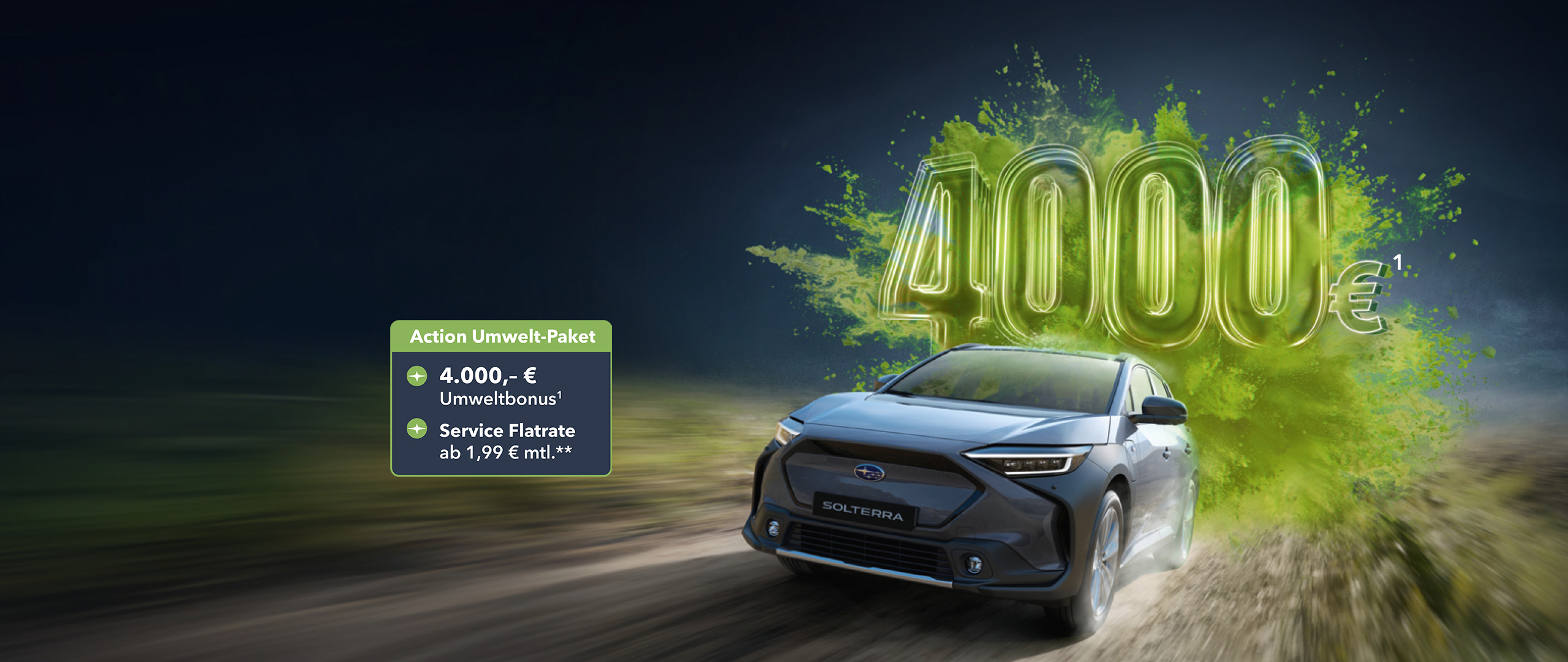 1 Die Aktion gilt vom 01.10.2025 bis 31.12.2025 in Verbindung mit dem Kauf eines sofort verfügbaren Subaru SOLTERRA (Vorführwagen und junge Gebrauchtwagen), Zulassung/Besitzumschreibung bis 31.12.2025 bei teilnehmenden Subaru Partnern. Die Aktion wird gemeinsam von der SUBARU Deutschland GmbH und den teilnehmenden Subaru Partnern getragen und ist mit allen Aktionen der SUBARU Deutschland GmbH für das Modell SOLTERRA kombinierbar. Sie sparen 4.000,- €. Weitere Detailinformationen erhalten Sie bei Ihrem teilnehmenden Subaru Partner oder unter www.subaru.de.